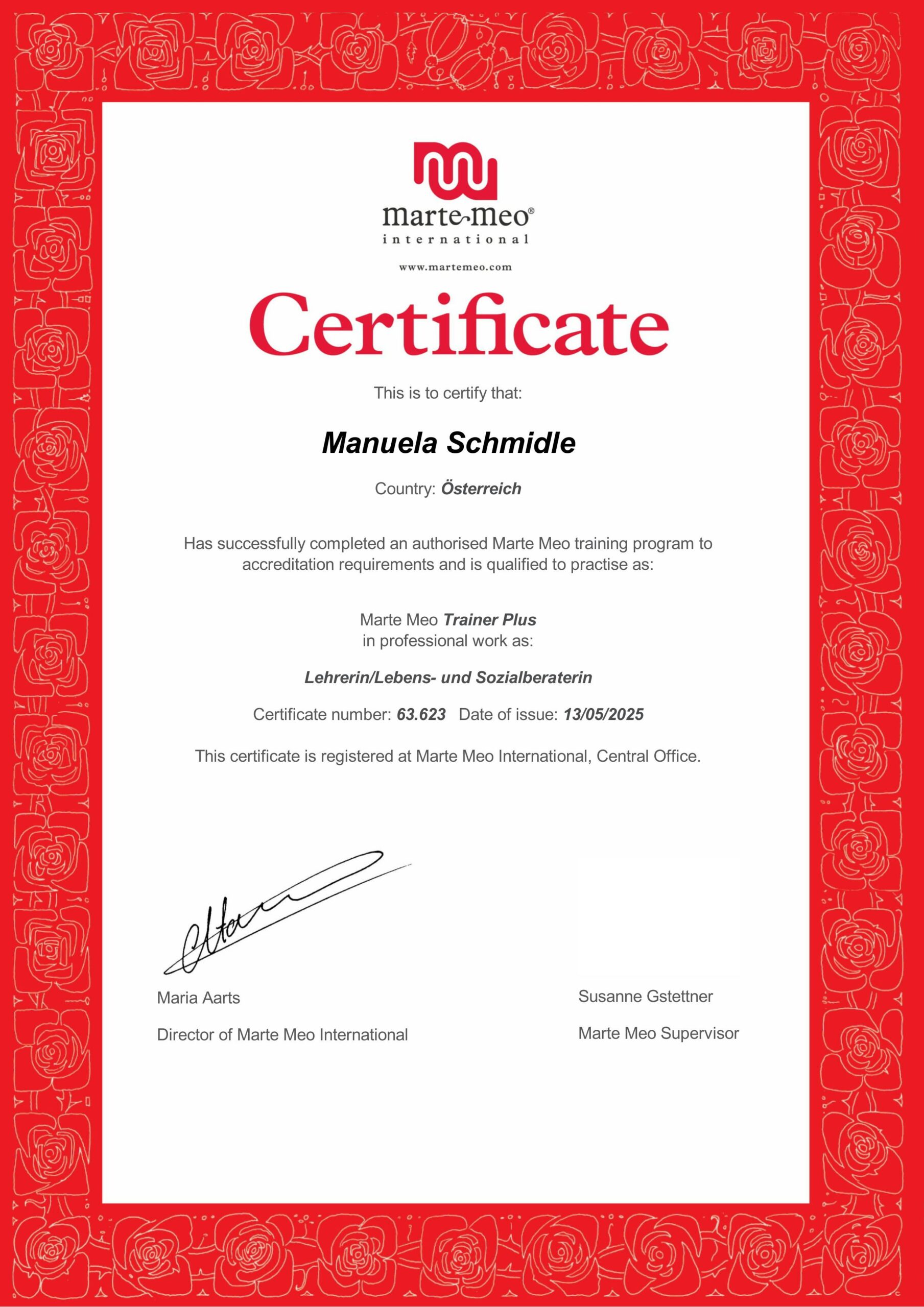 Die Methode, entwickelt von Maria Aarts in den Niederlanden, hilft, Entwicklungspotenziale zu erkennen und zu fördern. Der Name Marte Meo® bedeutet „aus eigener Kraft“. Marte Meo® nutzt kurze Videoaufnahmen aus dem Alltag. Diese werden gemeinsam angesehen und gelungene Interaktionsmomente besprochen. Daraus entstehen Ideen, um die Kommunikationsfähigkeit und den Kontakt mit Menschen zu verbessern.